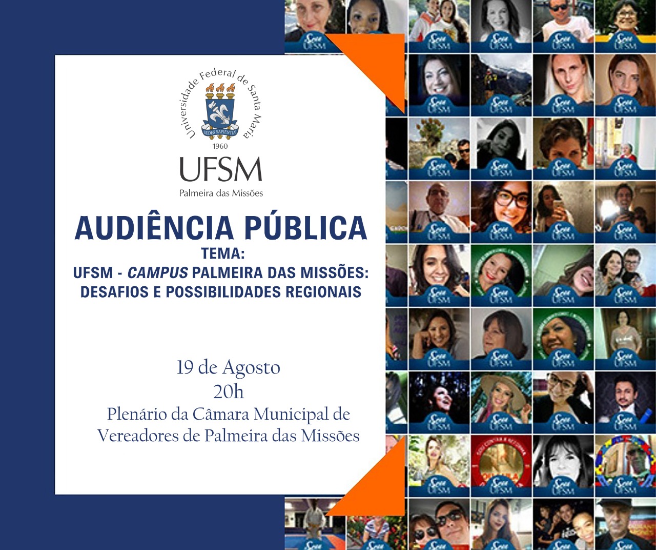 Na próxima segunda-feira (19) acontece a Audiência Pública "UFSM - 55BET Pro Palmeira das Missões: Desafios e Possibilidades Regionais", no Plenário da Câmara Municipal de Vereadores de Palmeira das Missões, às 20h.