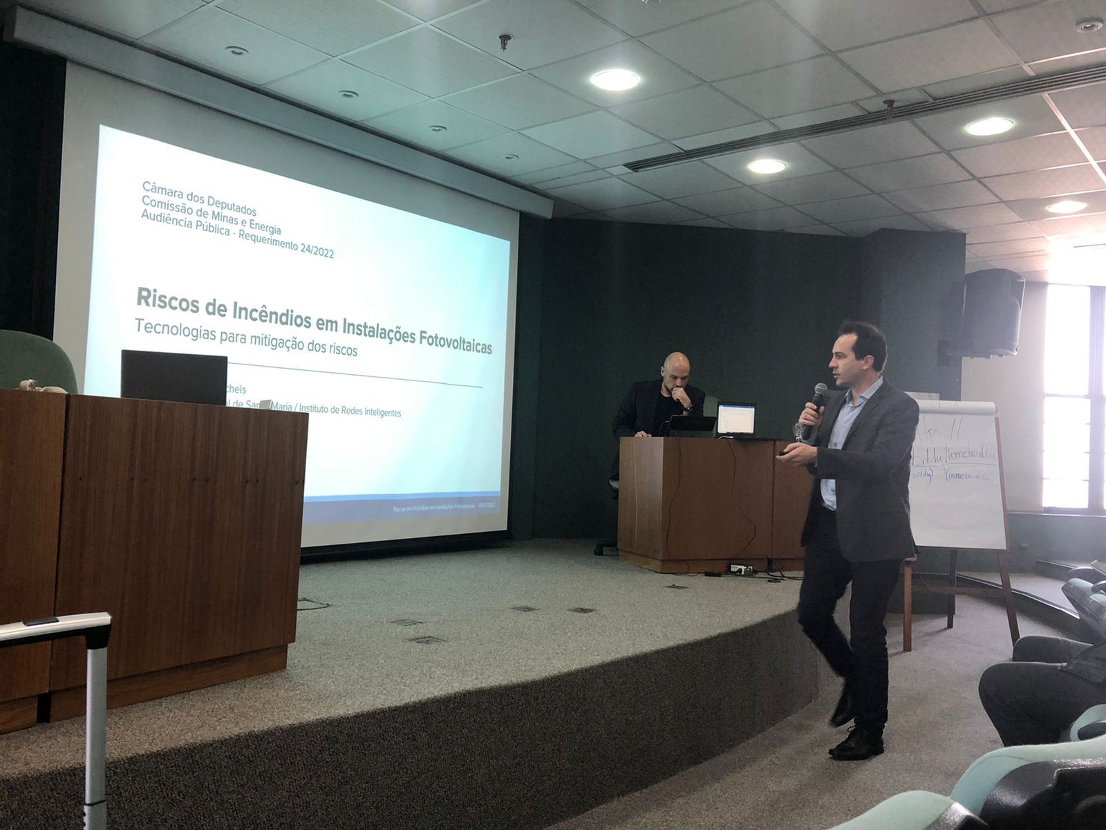 O professor Leandro Michels, do Instituto de Redes Inteligentes (INRI) do Centro de Tecnologia da UFSM, participou, na manhã do dia 06 de junho, da Audiência Pública "Riscos de incêndio em instalações de geração fotovoltaica de energia", junto à Comissão de Minas e Energia da Câmara dos Deputados.
