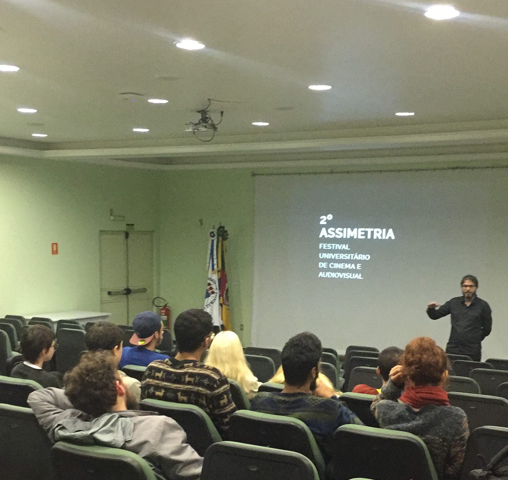 Mesmo com a forte chuva que caiu no final da tarde desta segunda-feira (27), o público não deixou de prestigiar a abertura do 2º Assimetria – Festival Universitário de Cinema e Audiovisual, que ocorreu no auditório multimídia do prédio 67, no campus sede da UFSM. Os 53 curta-metragens selecionados serão exibidos simultaneamente com a Universidade Federal de Santa Catarina (UFSC), co-organizadora do evento, parceira da UFSM nessa proposta.
