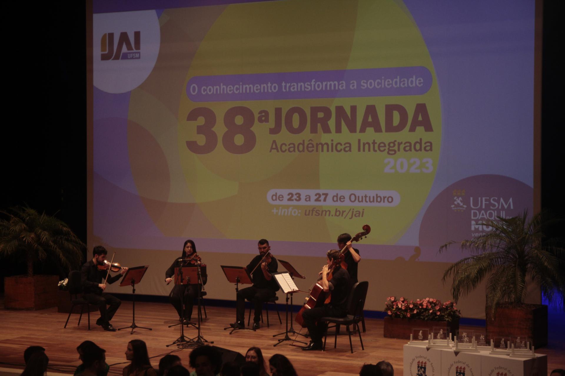 Com a trilha sonora embalada pelo quinteto de cordas da Orquestra Sinfônica de Santa Maria, ocorreu na manhã desta segunda-feira (23) a cerimônia de abertura oficial da 38ª Jornada Acadêmica Integrada (JAI), no Centro de Convenções da UFSM. Com o tema “O conhecimento transforma a sociedade”, a edição deste ano é a maior já realizada, com quase seis mil trabalhos inscritos nas áreas de ensino, pesquisa, extensão e inovação. O objetivo do evento é estimular a iniciação de alunos de graduação e de pós-graduação no meio acadêmico, através da troca de experiências e divulgação de trabalhos.