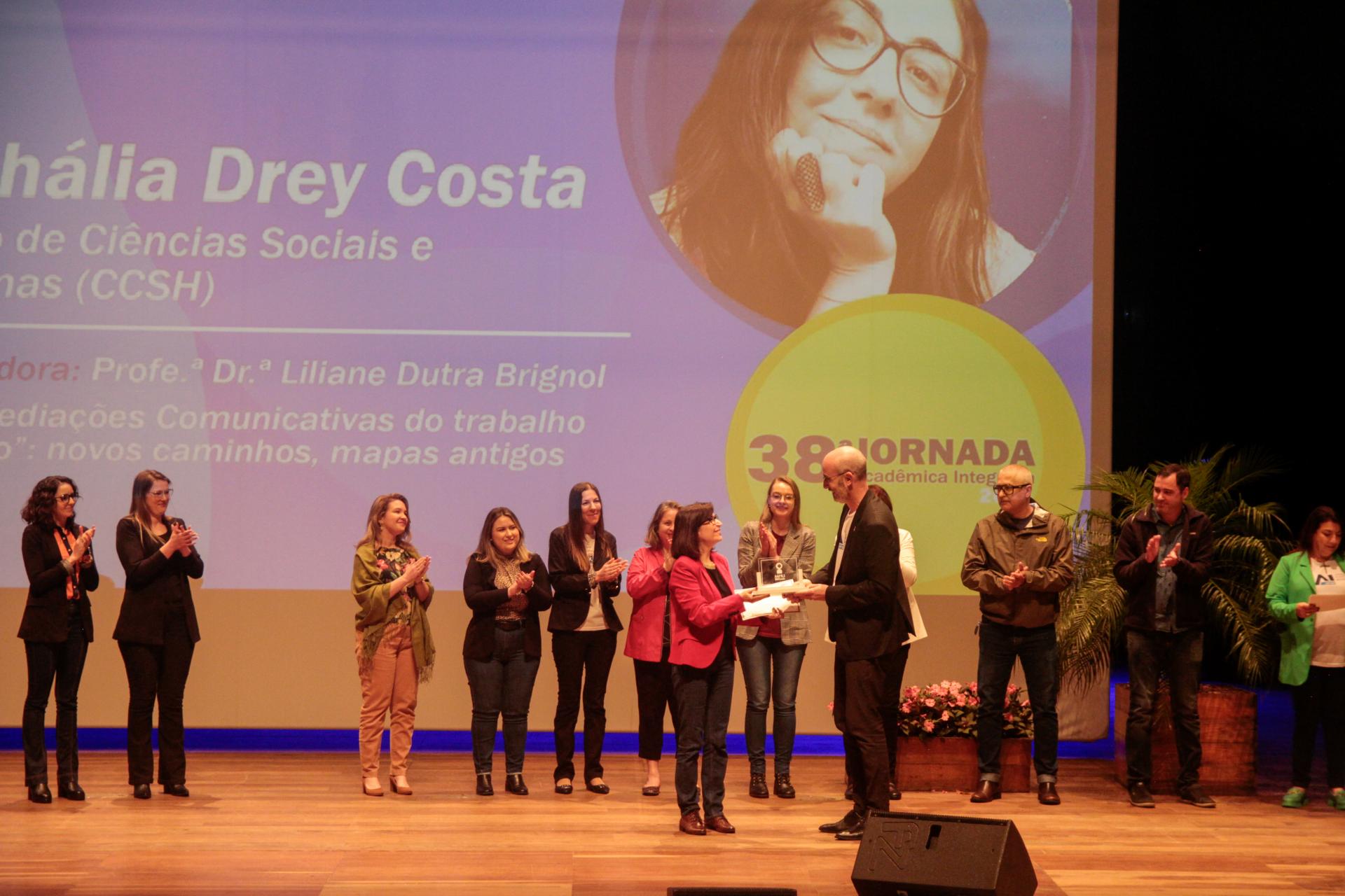 A primeira vencedora do prêmio foi Nathália Drey Costa, representante do Centro de Ciências Sociais e Humanas (CCSH). O trabalho intitulado “Mediações Comunicativas do trabalho ‘criativo’: novos caminhos, mapas antigos” teve a orientação da professora Liliane Dutra Brignol. Nathália foi representada na cerimônia por Liliane. Os demais concorrentes receberam uma menção honrosa.