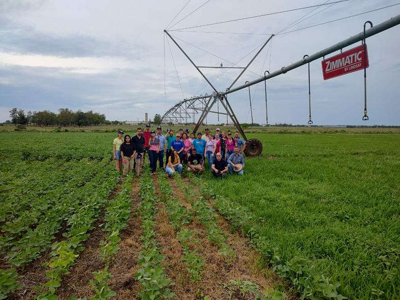 Para finalizar os trabalhos, visitamos a estação experimental do Irga em Uruguaiana (foto 08), onde o Engenheiro Agrônomo Cleiton Ramão apresentou o experimento cultivado com soja e arroz irrigado por pivô central em área escarificada e não escarificada e que, no inverno, são implantadas pastagens para avaliação de ganho de peso dos animais, em uma integração lavoura/pecuária. Como testemunha (tratamento não irrigado) são utilizadas as parcelas que tangenciam o pivô central e para cultura do arroz é cultivada uma área por irrigação por sulco (sistema tradicional).