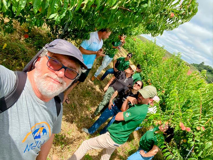 Na parte da manhã, o grupo foi recebido pelo produtor de pêssegos e videiras, Sr. Marlecio Waide, que iniciou o encontro com um café da manhã acolhedor. Durante a visita aos pomares, os alunos observaram diferentes cultivares de pêssegos em produção, aprendendo sobre a condução das plantas, manejo integrado de pragas e doenças, além de aspectos técnicos relacionados à escolha das variedades. Um ponto destacado foi a transição realizada pelo produtor, que migrou da cultura do tabaco para a fruticultura, compartilhando suas motivações e desafios nesse processo.