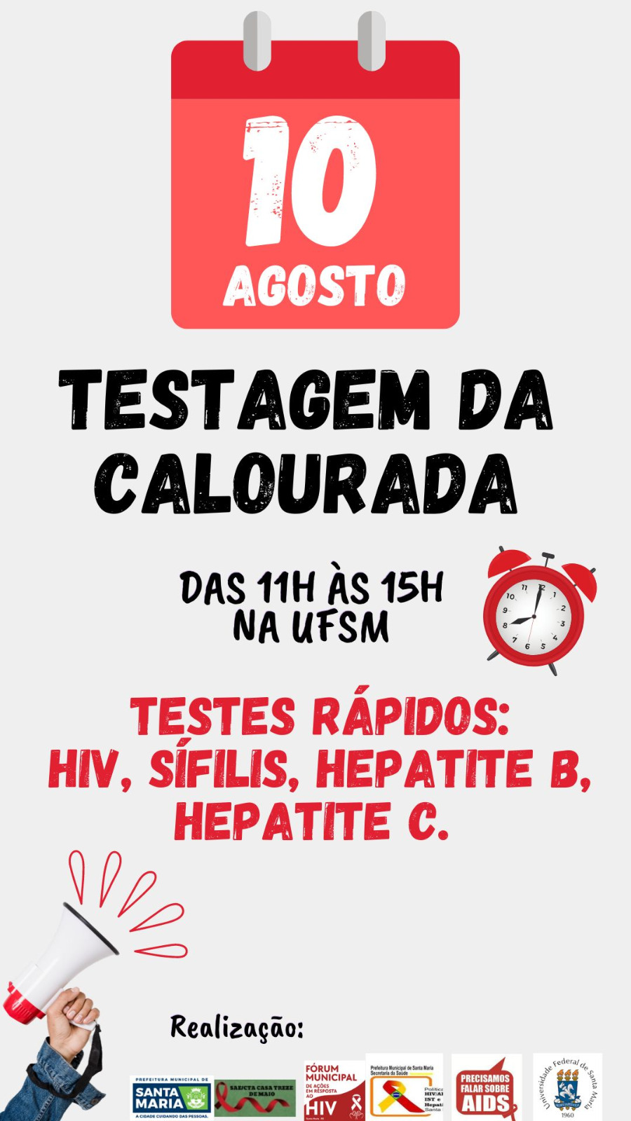 - Como forma de prevenir e combater as Infecções Sexualmente Transmissíveis (ISTs), a UFSM, o Hospital Universitário de Santa Maria (HUSM/EBSERH) e a Prefeitura de Santa Maria realizam ações de testagem rápida para sífilis, hepatite e HIV na próxima quinta (10). A ação ocorrerá no hall do Restaurante Universitário (RU) das 11h às 15h. A iniciativa é uma parceria do do Setor de Atenção à Saúde Integral do Estudante da Pró-Reitoria de Assuntos Estudantis, do Núcleo de Vigilância Epidemiológica do HUSM e da Política Municipal de HIV/Aids.