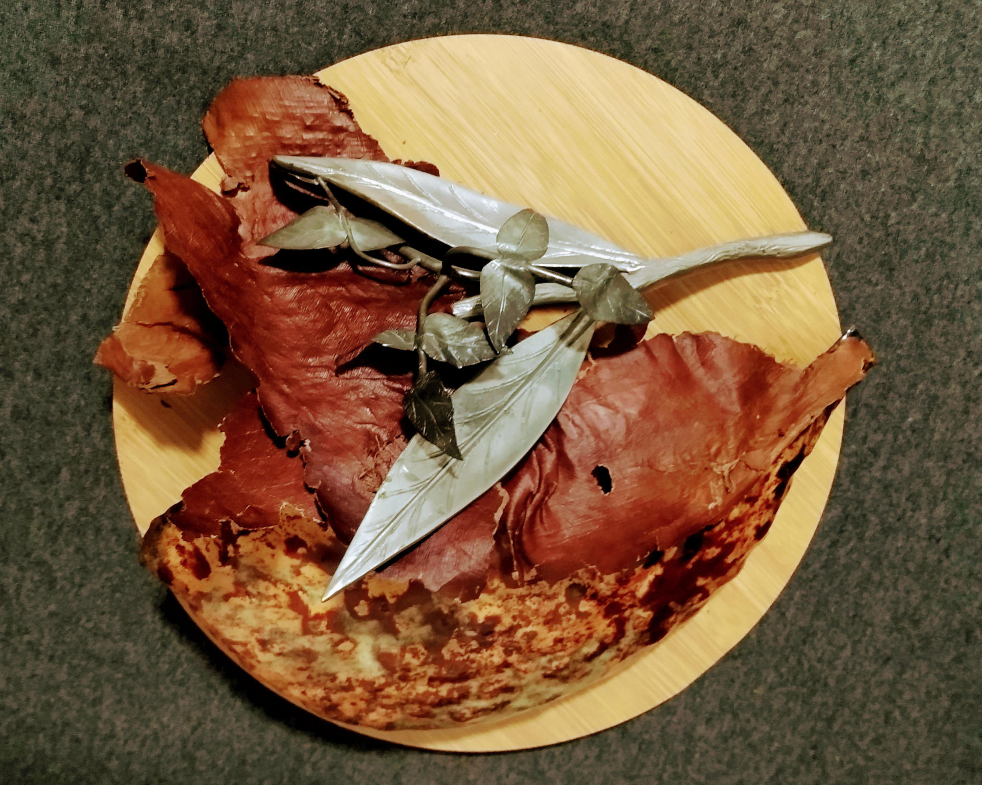 Linguagem e Técnica: Objeto/composição. Madeira, cobre esmaltado, estanho, prata e casca de árvore (resíduos).