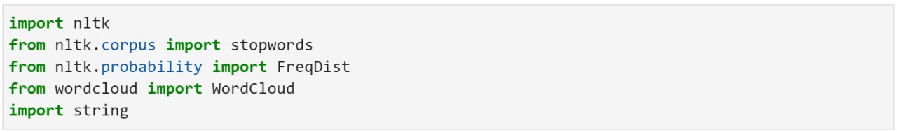 Após definir sua base de dados, salve-a em um arquivo.txt, na mesma pasta que você criará seu arquivo do Jupyter Lab, isso facilitará o acesso aos dados. Depois de criado o arquivo com o texto e o arquivo do Jupyter Lab, podemos começar importando as bibliotecas que serão utilizadas. A biblioteca NLTK (Natural Language Toolkit) será usada para o tratamento do texto, onde será possível realizar a remoção de stopwords e calcular a frequência de cada palavra. Já a Wordcloud é a biblioteca responsável pela configuração e criação da nossa nuvem de palavras. E a biblioteca string será utilizada para realizar a remoção de toda pontuação desnecessária do texto. Vamos ao código: