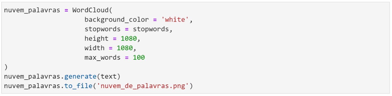 Para isso será utilizada a biblioteca wordcloud. Definimos a cor do fundo como branco, as stopwords em português, para que apareça somente as palavras chaves do texto, a altura e largura de 1080 pixels e o número máximo de palavras escolhido. Lembrando que existem muitas outras opções para configurar a wordcloud do seu jeito, informações que podem ser encontradas no site da documentação da biblioteca.