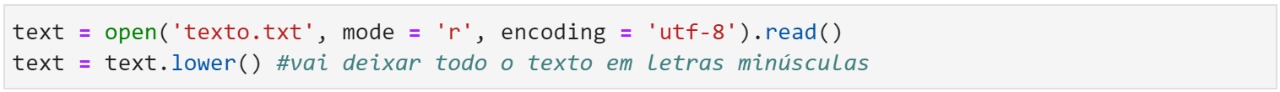 Será realizada a abertura do arquivo em modo leitura, e em seguida, a função .lower() deixará o texto todo minúsculas.