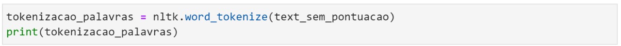 Agora o texto inteiro será separado em palavras únicas, para que seja possível realizar o cálculo de frequência das palavras e a verificação das stopwords. A função nltk.word_tokenize() da biblioteca nlkt realizará o processo de tokenização.