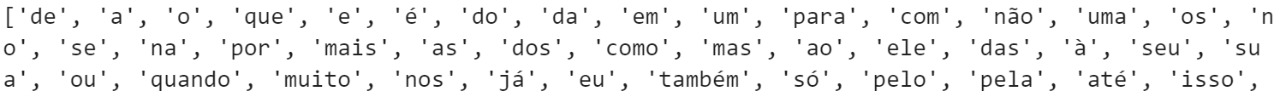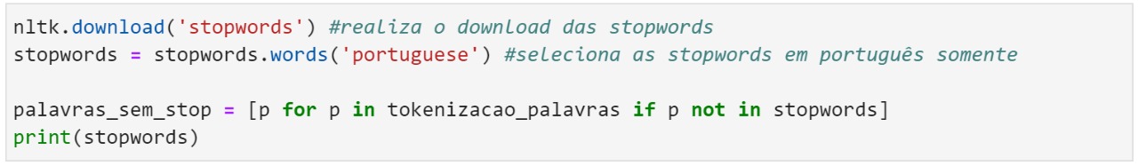Aqui será realizado o download das stopwords em português, que como explicado anteriormente, são as palavras que quando retiradas de um texto, o sentido não é alterado. Devido a isso iremos removê-las do texto, para trabalharmos com uma base de dados menor.