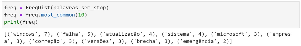 Após ter sido realizada a limpeza do texto, é possível checar o número de aparições das principais palavras. A função .most_common() da biblioteca nltk irá retornar as 10 palavras que mais aparecem no texto, sendo printado a palavra seguido do número de vezes em que é usada.