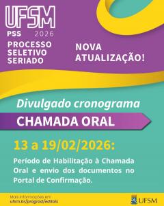 LISTA DE ESPERA As orientações para a Chamada Oral Presencial da Lista de Espera do PSS também já foram divulgadas. Todas as pessoas com nome na lista têm até o dia 19/2 para realizar a Habilitação, enviando seus documentos via Portal UFSM. A Chamada Oral acontecerá apenas para os cursos do campus sede descritos no Quadro de Vagas, no dia 24/2, conforme Edital.